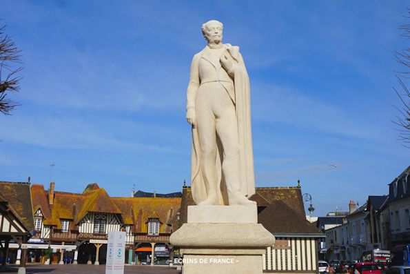 モルニィ広場は、ドーヴィルのおへそにあたり、広場から8本の道路が、駅方面、海岸方面、競馬場方面へとドーヴィルの主要な場所に向かって放射線状に延びている。中央に噴水が置かれ、夏は水しぶきで涼しげな雰囲気を呈するが、この日は噴水も休みだった(淋しい)。広場を囲んでブラッスリー、カフェ、商店が建ち並び、ドーヴィルで最もにぎわう場所の一つ。広場の名前は、ヨットハーバーにも登場したモルニィ公爵にちなんで名づけられ、モルニィ公爵の像が広場から遠くを見渡しているのが印象的だ。実は、この像はブロンズ製だったが、第二次世界大戦でドイツ軍によって溶解されてしまい、1955年に現在の像が再建されたとのこと。そういえば、ノルマンディ地方は第二次世界大戦中に過激な戦場と化し、1944年の連合軍によるノルマンディ上陸作戦は史上最大規模の上陸戦が繰り広げられたという歴史がある。
