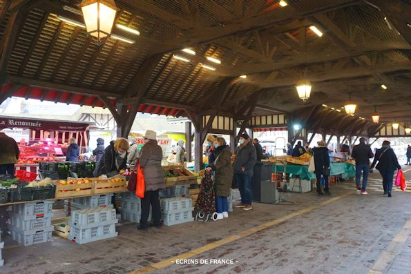 ホテルから5分ほど歩くと、モルニィ広場に面して屋根付き野外市場が現れた。ノルマンディ地方固有の瓦屋根とティンバーフレーミングの可愛らしい建物だ。1923年に設置された歴史ある市場で、毎朝7時から13時30分までオープン。地元生産者直販の野菜・果物、ノルマンディー産の鶏、チーズ(ノルマンディーはチーズ王国)、肉加工品、そしてシーフードなど、ノルマンディ郷土料理の基礎となる食材が並ぶ。まさに町人の胃袋といえよう。
