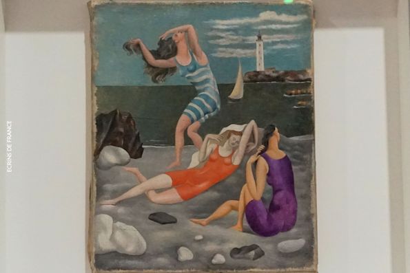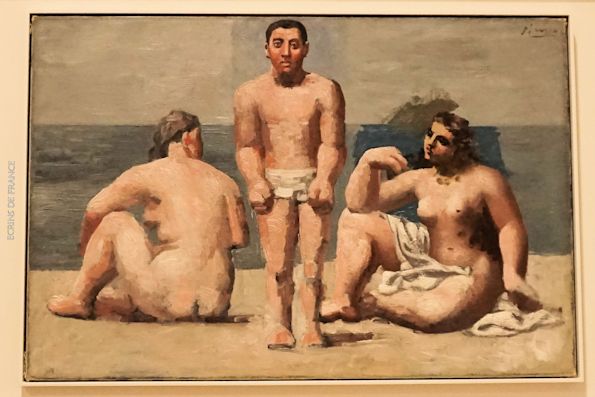 1918年夏、フランス南西部の高級リゾート地ビアリッツでバカンスを過ごしたときに制作された「水浴の女たち(Les Baigneuses)」はプロポーションが多少デフォルメされているが、1907年の『アヴィニヨンの娘たち』とは異なり、とても写実的な作風といえる。専門家は、1915年から1925年頃を「ピカソの新古典主義の時代」と呼ぶ。イタリア旅行中にギリシャやローマの古代美術からインスピレーションを得たようだ。また、フランス・ブルターニュ地方の海岸リゾート地ディナールで休日を過ごした夏に制作された『浜辺を走る二人の女性(Deux Femmes courant sur la place)』は、古代美術の彫像を彷彿とさせる量感豊かなボディで描かれ、腕から足へと流れるラインが躍動感を生み、両手を広げて走る姿は歓びに満ちあふれている。妻オルガさんとの間に息子が生まれた翌年の作品で、ピカソの「幸福感」が伝わってくる(写真がなくて申し訳ない)。