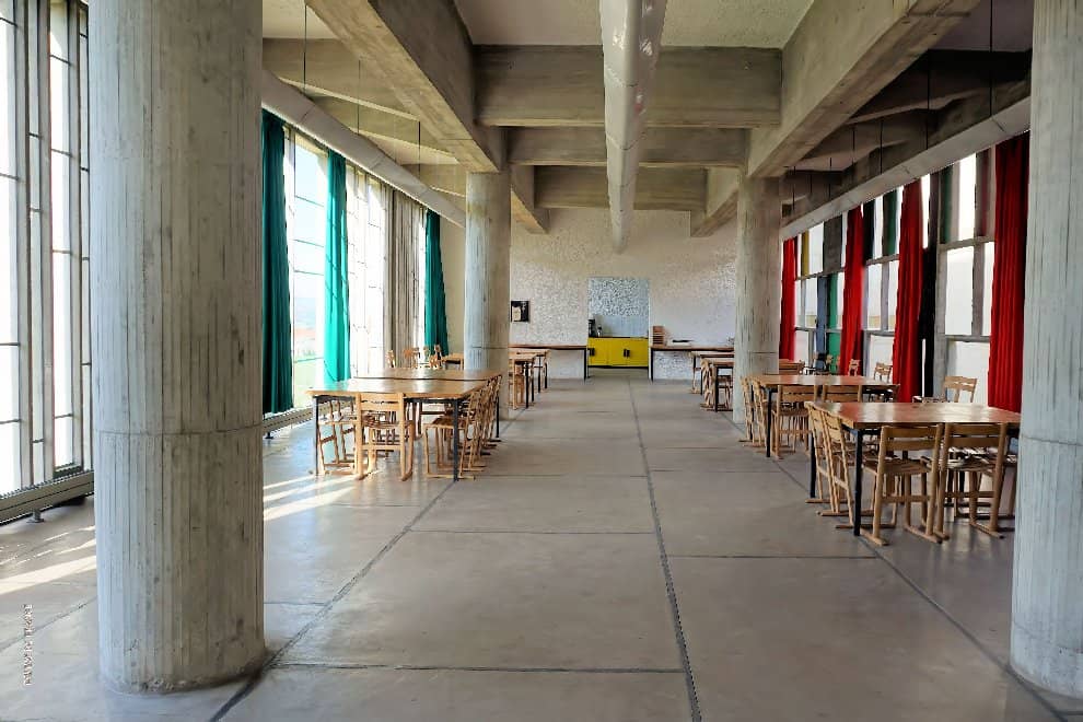食堂は直方体の広々とした空間に、太い円柱が配置され、伝統的な教会の身廊を想起させ、「波動式ガラス壁」の幾何学的模様が、抽象画家ピート・モンドリアン(Pieter Mondrian、1872年-1944年)の作品『コンポジション』を彷彿とさせる。