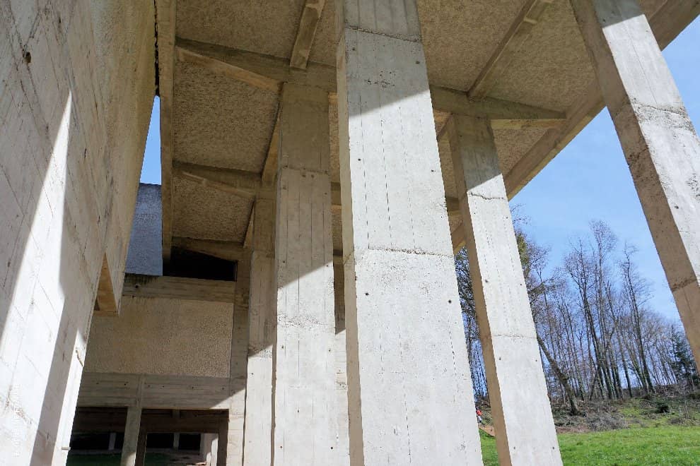 外から見れば一目瞭然だが、緩やかな斜面に建てられた修道院は、ル・コルビュジエのトレードマークともいえる「ピロティ」と呼ばれる柱構造で地上からの高さを調整し、床面を水平にしているところが特徴的だ。