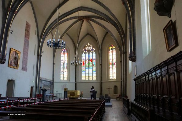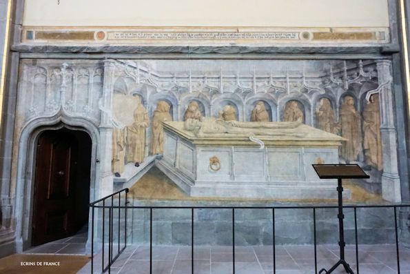かつて修道院の礼拝堂であったこともあって、彫刻装飾のない、シンプルな正面ファサードが印象的だ。教会内に入って内陣まで進むと、左側の壁に、サヴォワ公爵とブルゴーニュ公の顧問を務めたフィリベール・ド・モント―の墓が描かれた葬祭壁画がある。15世紀半ばの作品だが、この壁画には遠近法が用いられ、だまし絵の手法で描かれてる。ルネサンス初期の作品で、奥行きを出そうとしている作者の努力がたいへん微笑ましい。