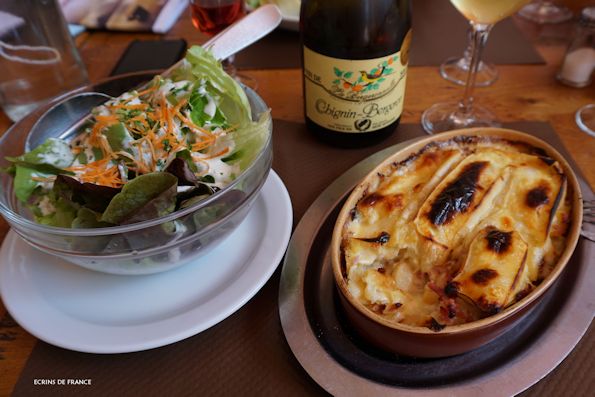 お食事処には困らないのがアヌシーの町。どこに入っても当たり外れが少ないのでご安心を。今回のアヌシー散策では、ティウー運河沿いにあるレストラン「ル・ボー・ソレイユ(Le Beau Soleil)」で、サヴォワワインと一緒に郷土料理のタルティフレットを味わった。タルティフレット(Tartiflette)は、炒めた玉ねぎとベーコン、にんにく、茹でたジャガイモを生クリームで和えて器に入れ、サヴォワ特産のルブロション(Reblochon)チーズをのせてオーブンで焼いた料理。胃が破裂しそうなほどのボリュームだった。